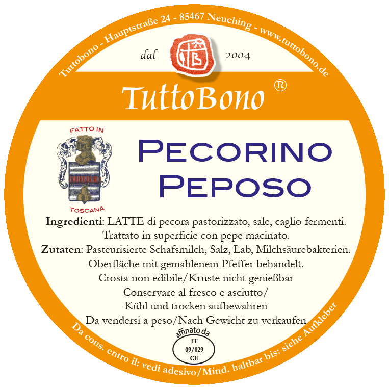 Pecorino "Peposo" und Pecorino "Il Pallottino", ca. 500g pro Form. Aus reiner Schafsmilch (pasteurisiert), ca. 40-45% Fettanteil, in der Maremma produziert. Normalerweise wird diese Köstlichkeit nur im Oktober hergestellt und kann dann während des folgenden Jahres in unterschiedlichen Reifegraden genossen werden. Diese Käse schmecken immer gut, egal ob jung oder gereift, ist der würzig nussige, aber dennoch milde und elegante Grundgeschmack doch von Anfang an sehr ausgeprägt. Aus diesem Grund kann man sie jederzeit mit Marmelade, Honig oder, wie in der Toskana üblich, mit Birnen genießen. In gereiftem Zustand zudem unglaublich gut als geriebener Käse über Pasta. Der "Pallottino" wird einer herkömmlichen Reifung unterzogen, während der "Peposo" unter schwarzem Pfeffer reift und dadurch cremiger bleibt.