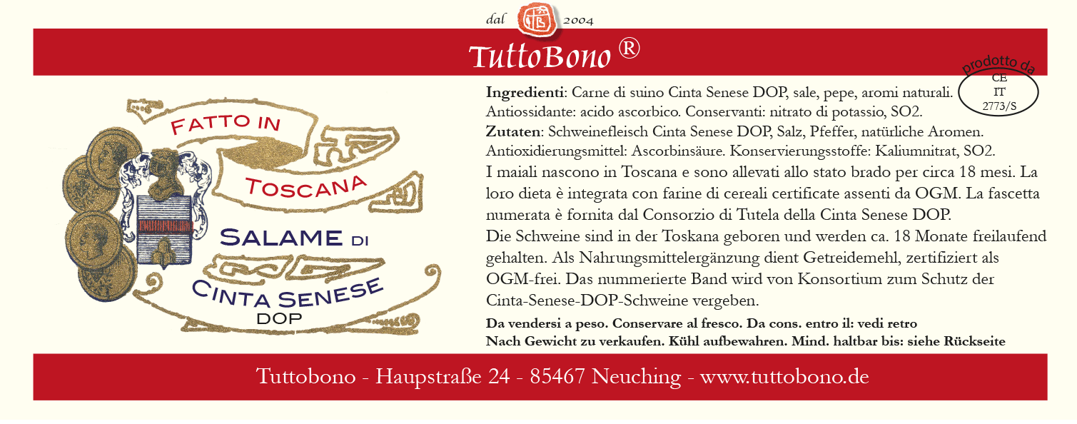 Diese Wurst ist aus dem Fleisch einer der ältesten Schweinerassen Italiens, die sogar schon in mittelalterlichen Zeiten in der Toskana lebte, aber dann fast ausstarb die versch. Schweine-Fotos unserer Homepage zeigen die schwarzen Riesen mit dem weißen „Gurt“ bzw. „Cinta“. Seit ca. 10 Jahren wieder gezüchtet, ist diese Fleischsorte sowohl in der Toskana als auch in ganz Italien „der letzte Schrei“ in Sachen Qualität und Geschmack des Fleisches: da es sich um Freihaltungs-Schweine handelt, die im Wald oder auf Wiesen herumlaufen und sich deswegen sehr natürlich ernähren, erhält ihr Fleisch und Fett einen einmaligen Geschmack, ist saftig, zart und hat eine unvergleichliche Farbe!